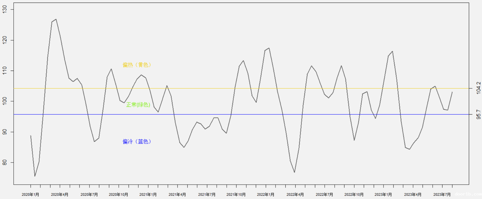 图1 中国铜需求量景气指数2020年1月至2023年8月,数据来源:国家统计局和海关总署的公开信息